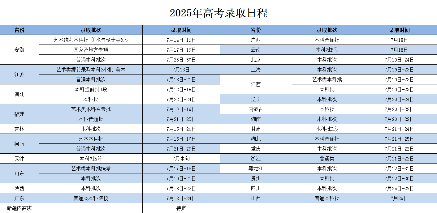 5、各省各批次录取大致时间安排如下,录取完结可查询情况请点击我校招生录取进程了解。